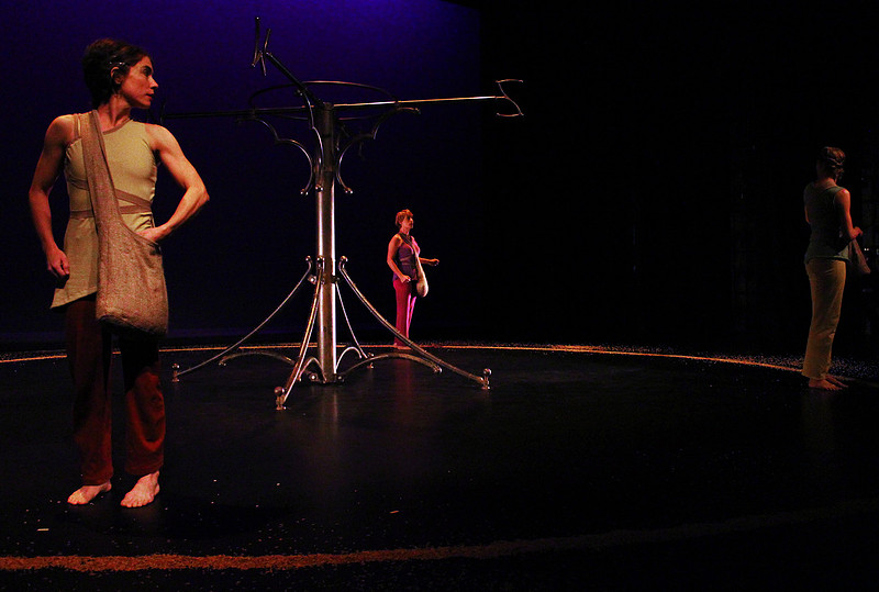The sculpture, illuminated with some gorgeous lighting design by Daniel Burkholder, points North, South, East, and West. The arrow spins above, constantly changing, and often casting the shadow of a spinning clock on the stage floor...damn, that's cool. The ladies climb over every inch of metal. Down and back up again, moving constantly between the two worlds and through the passage of time...I'm sweating just watching, but they look cool as cucumbers.