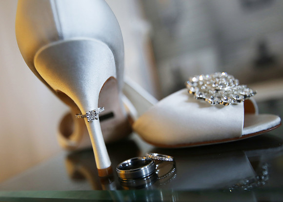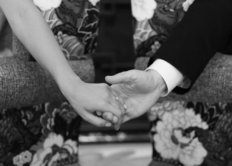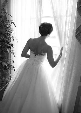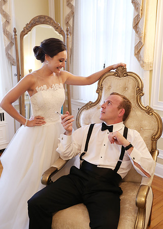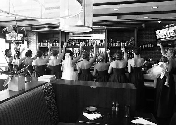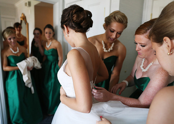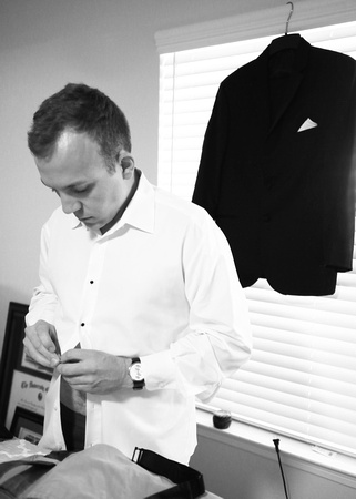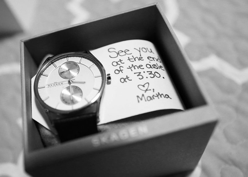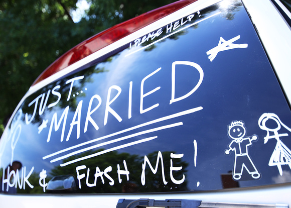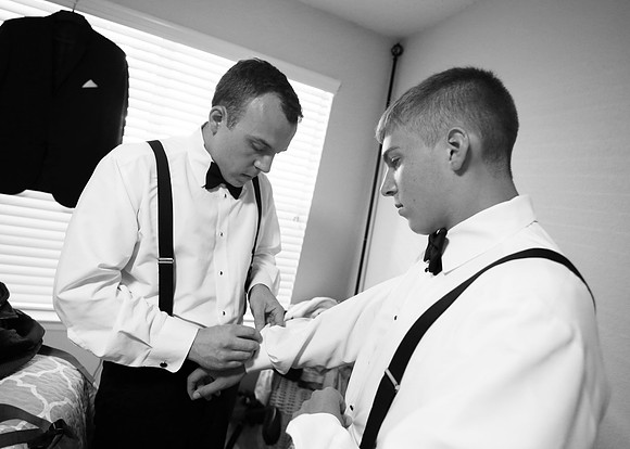 After video games and car decorating at Martha and Ben's new home, the guys and I come to the hotel. With the help of a great team, we pull off a "not quite first look." The lovebirds join hands, back to back, and enjoy a moment before heading off to the church.